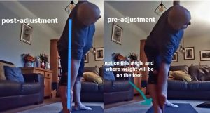 The challenge in this pose (Trikonasana) for my client is in bringing the body into one plane. An indication of this is how the weight is felt on that front foot. The adjustment has only shifted his alignment 1-2″ but is much harder work and more challenging to the core.